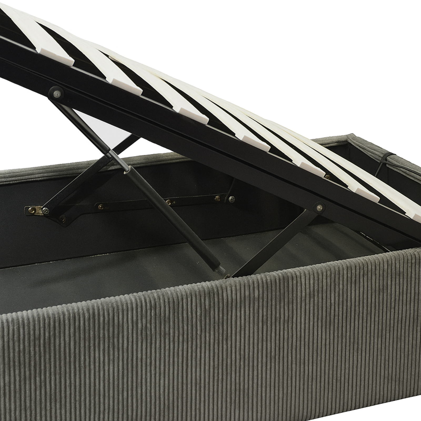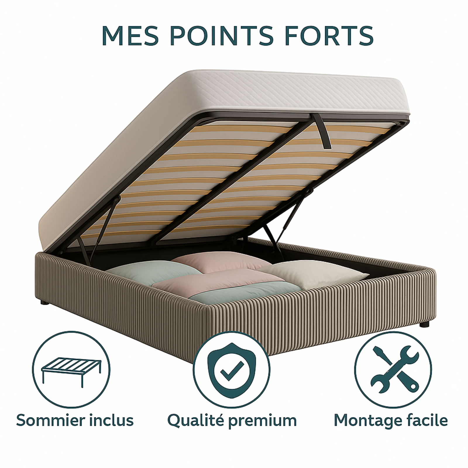 Lit coffre Cancun Gris | Sommier à lattes inclus | Robuste et Large Angle d’Ouverture