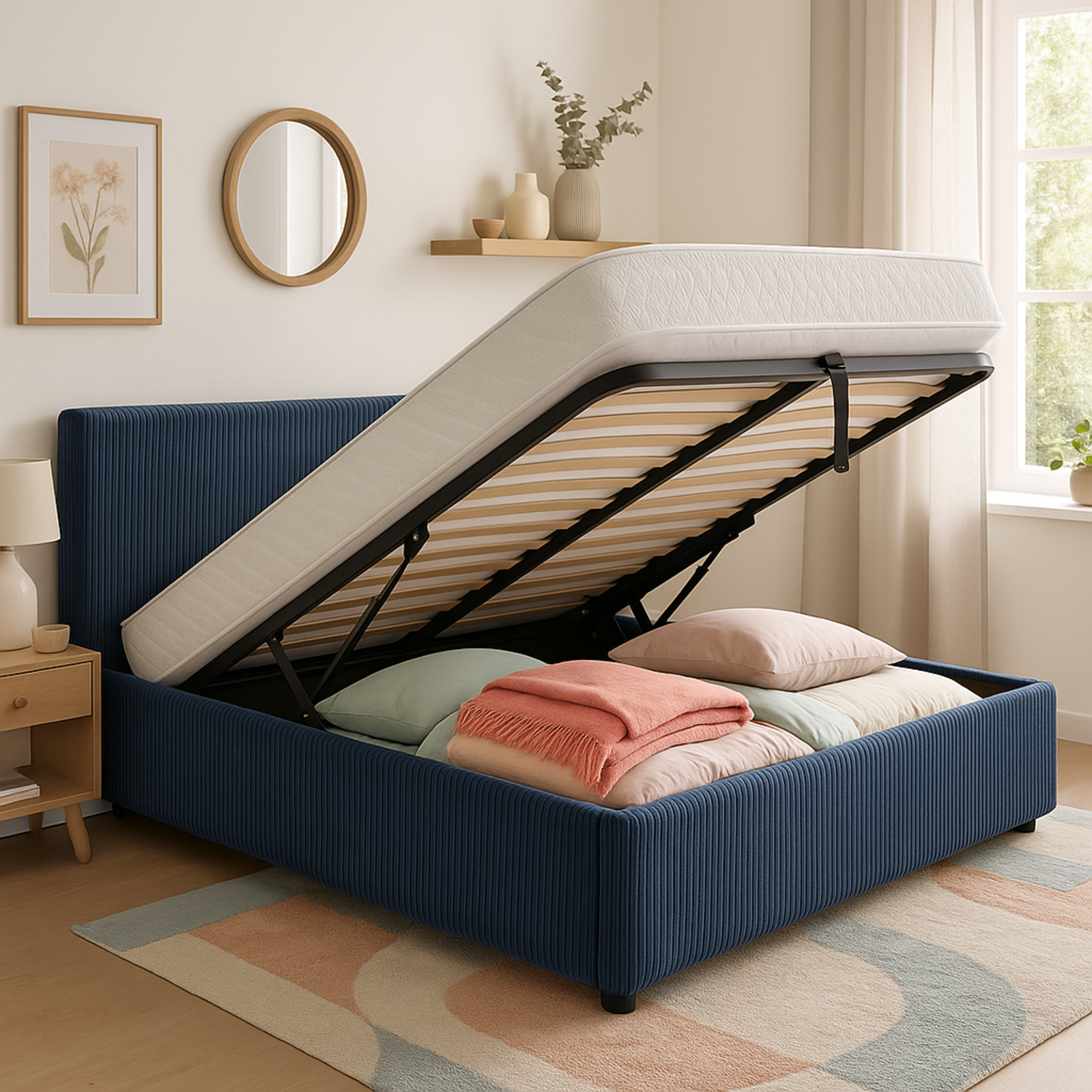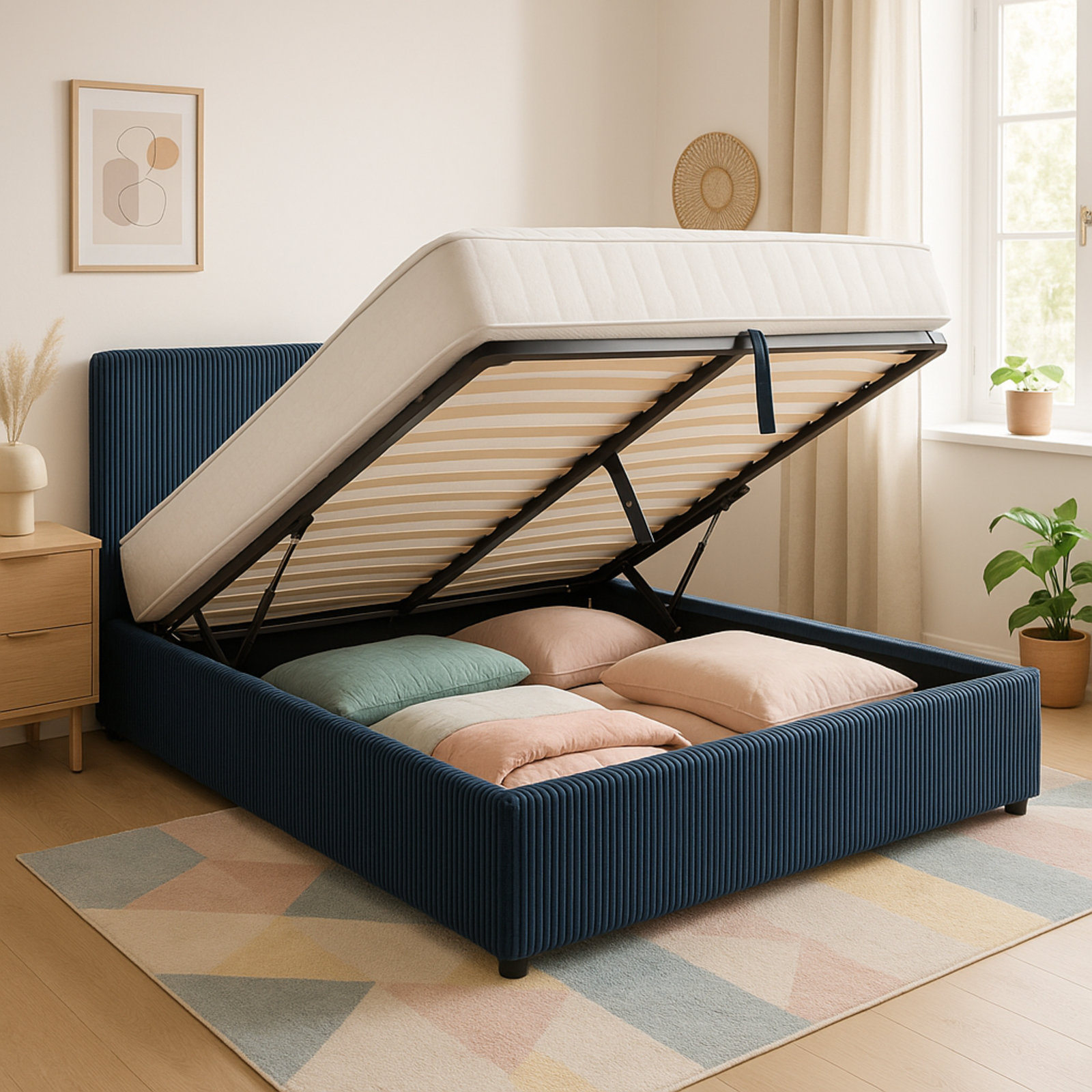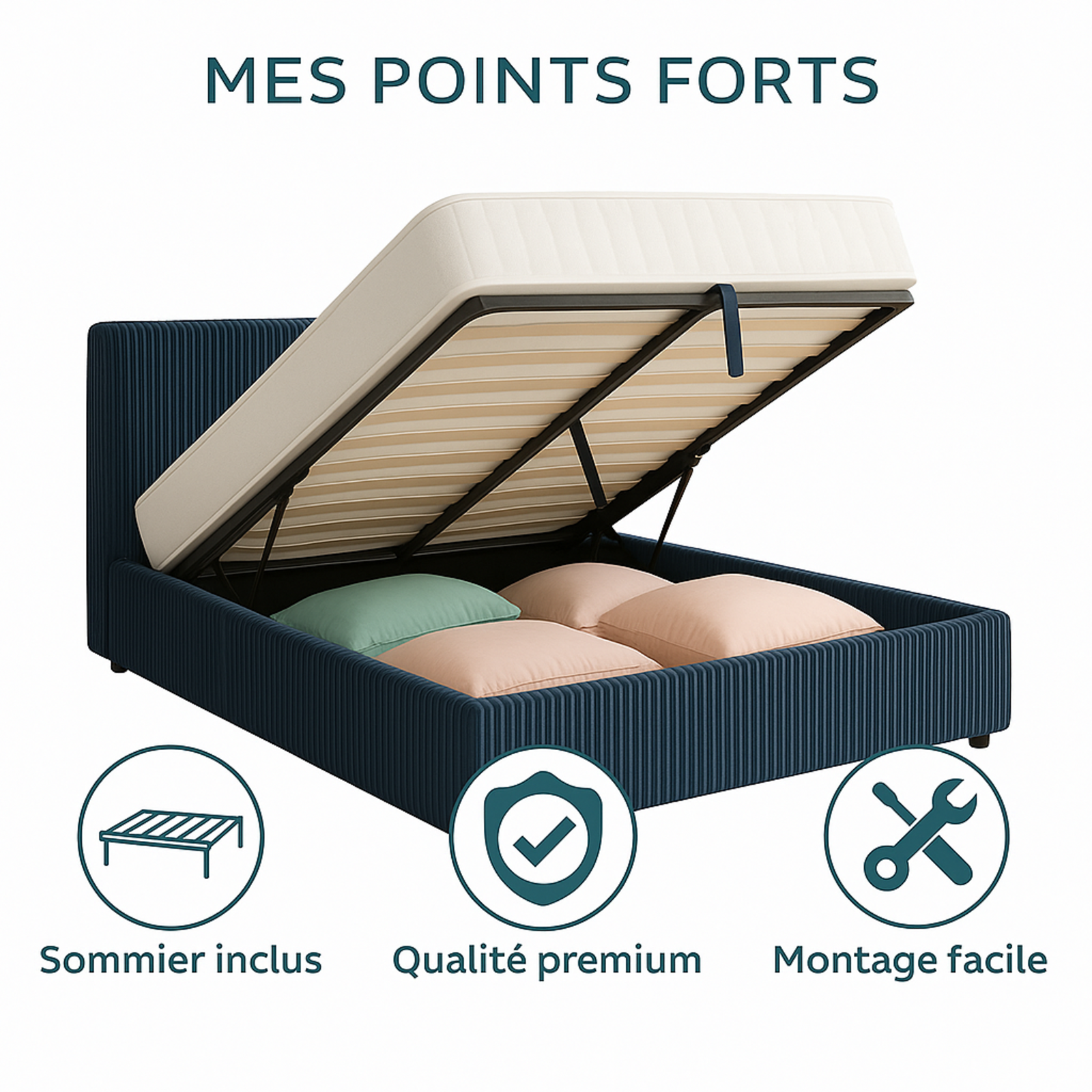 Lit coffre Colisée avec tête de lit | Velours cotelé Bleu nuit | Robuste et Large Angle d’Ouverture