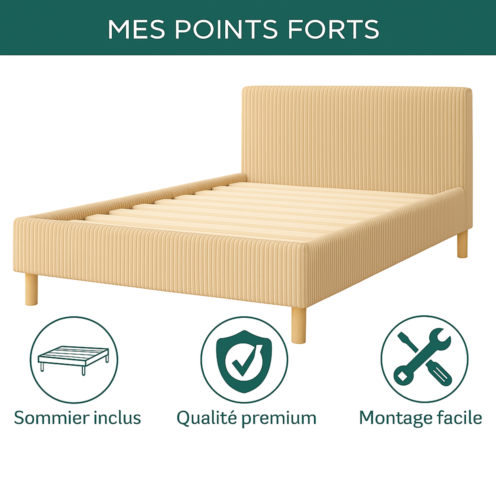 - Robustesse et durabilité : La structure du cadre en fibre de bois (MDF) et les pieds de renfort assurent une solidité à long terme, offrant une base stable et résistante pour une utilisation quotidienne.